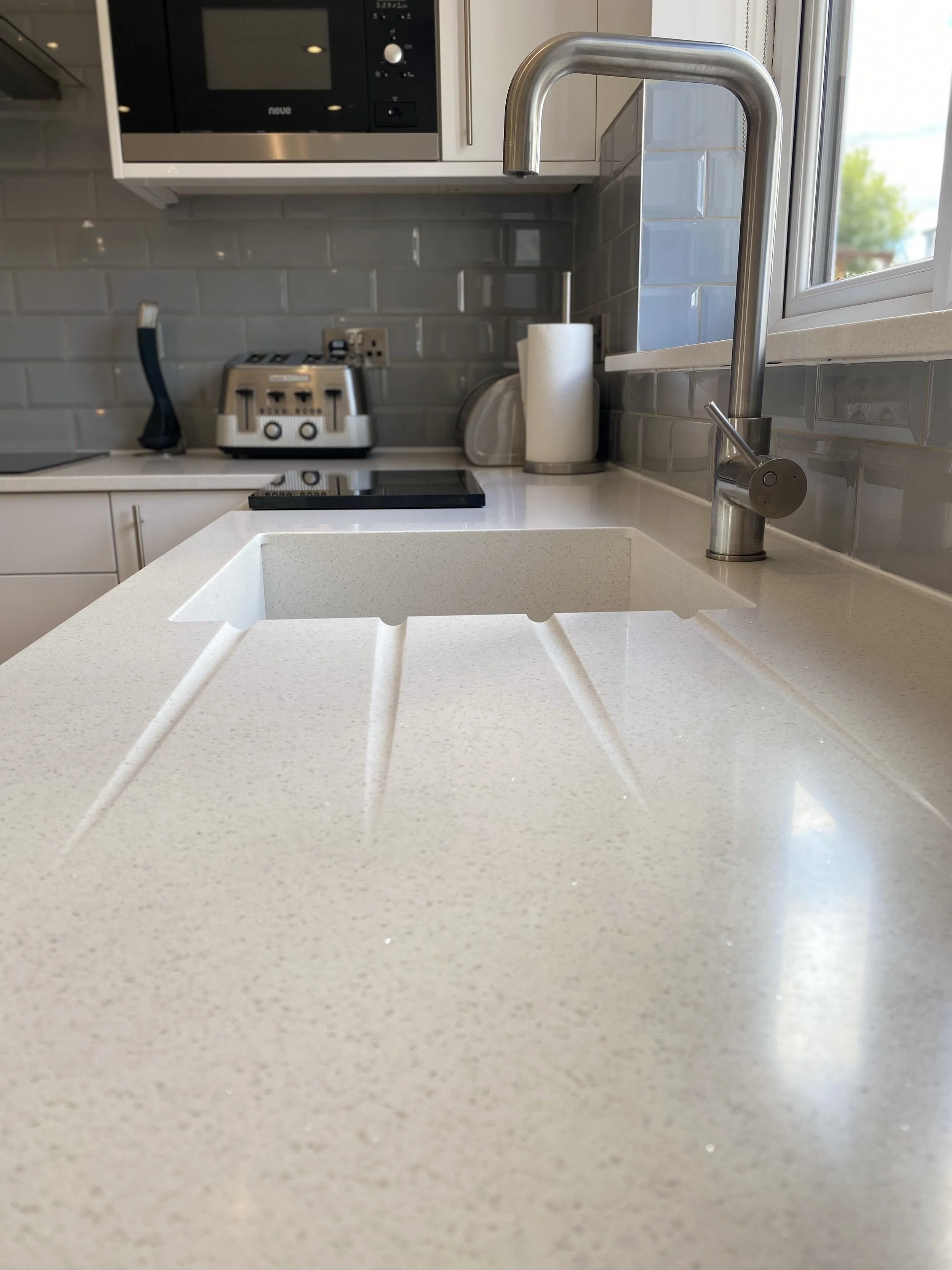 Quartz is durable but seams are always visible; Tristone can achieve seamless joins.