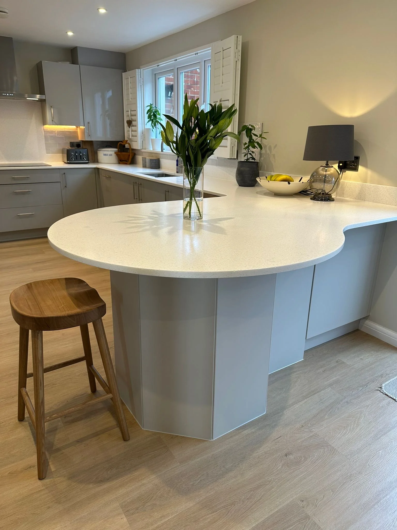 The client requested a full upgrade of their kitchen worktops and the addition of cupboards to form a peninsula with a breakfast bar. After reviewing their large Tristone sample display, they selected the Chalcedony finish for its subtle elegance and durability. The new worktops transformed the kitchen, creating a slightly more open, practical and visually cohesive space. The client was delighted with the outcome, praising the improved layout, increased functionality and premium finish.