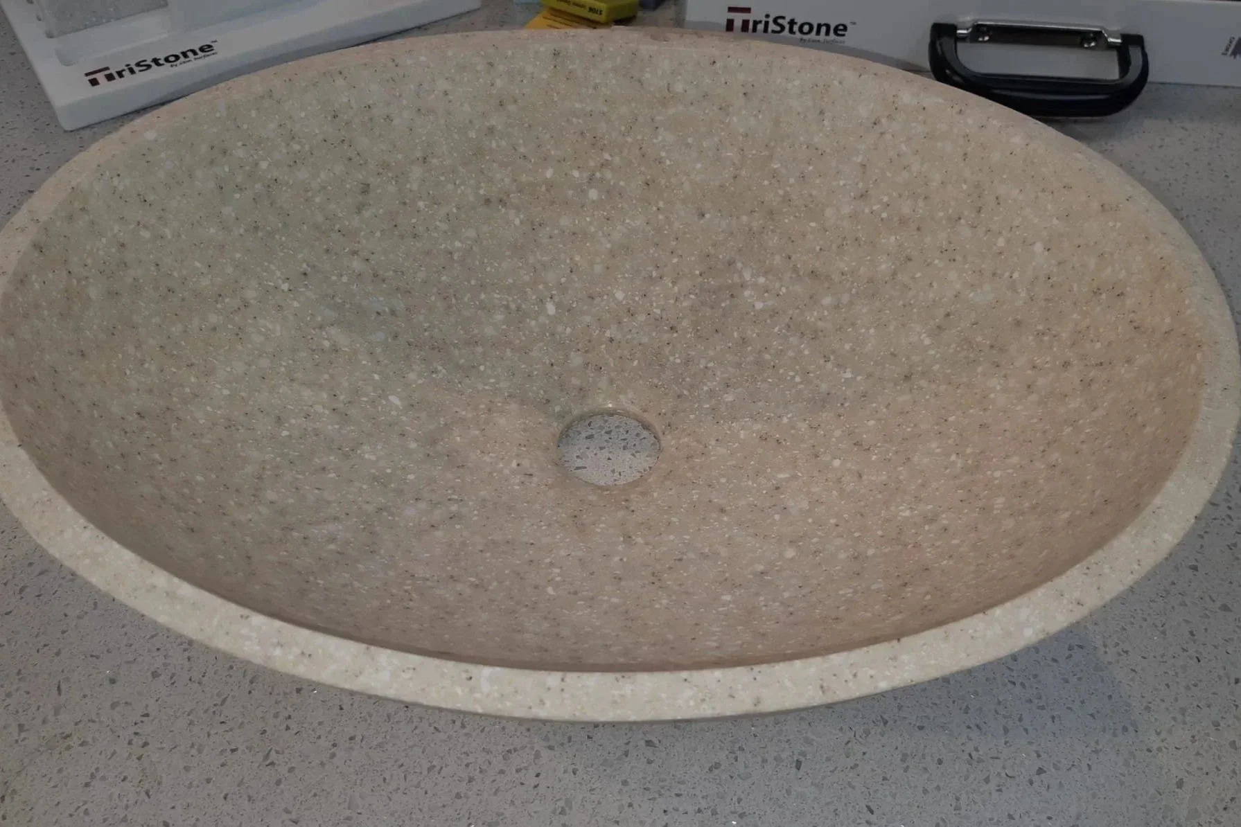 Example - What Tristone Gold Twilight solid surface looks like in different lightings (natural light / artificial light):
